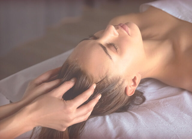 Aromaterapeutyczny masaż skóry głowy połączony z olejowaniem.